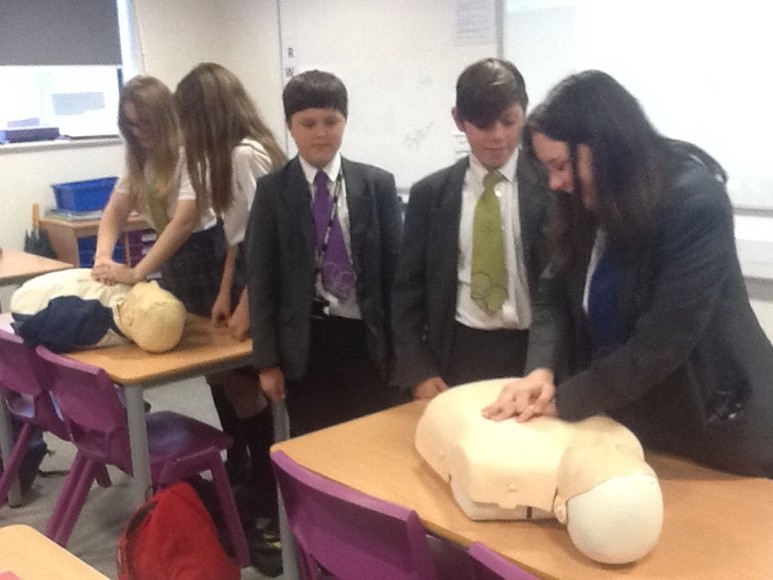 In recent Year 8 classes students have been learning about basic first aid, including how to make a 999 call, how to assess a patient, how to put someone in the recovery position and (in this photo) how to give CPR.