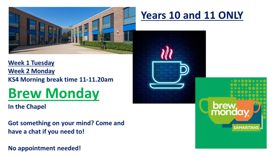 On Week 1 Tuesday and Week 1 Monday from 11-11:20am, Mrs James is avaliable in the chapel for a chat or conversation for Year 10s and 11s. The door is always open!